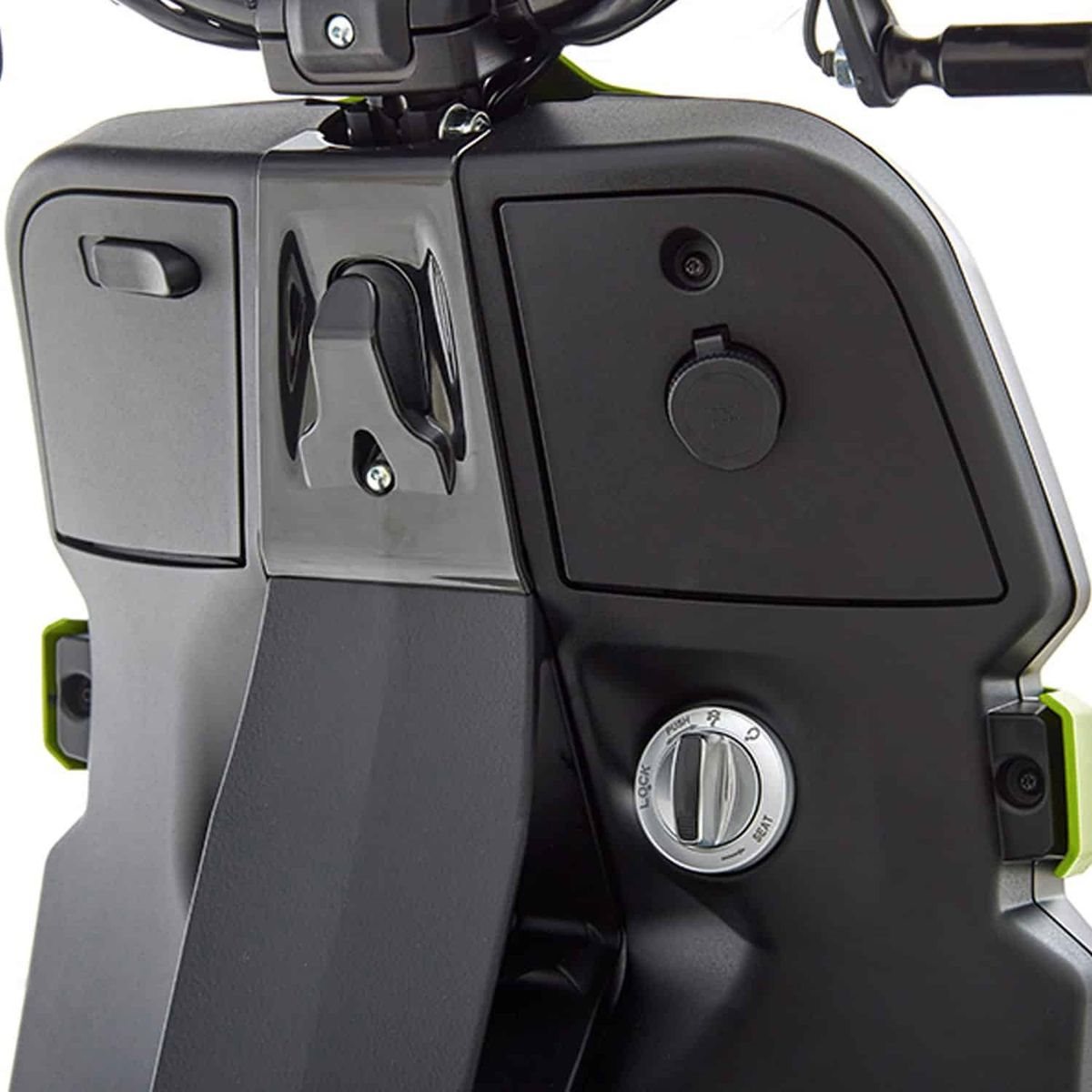 Die Batterie ist unter dem Sitz herausnehmbar und zusätzlich bietet der E-Roller ein 10 Liter Staufach. Bei der Anwendung einer 2. Batterie entfällt das Staufach.